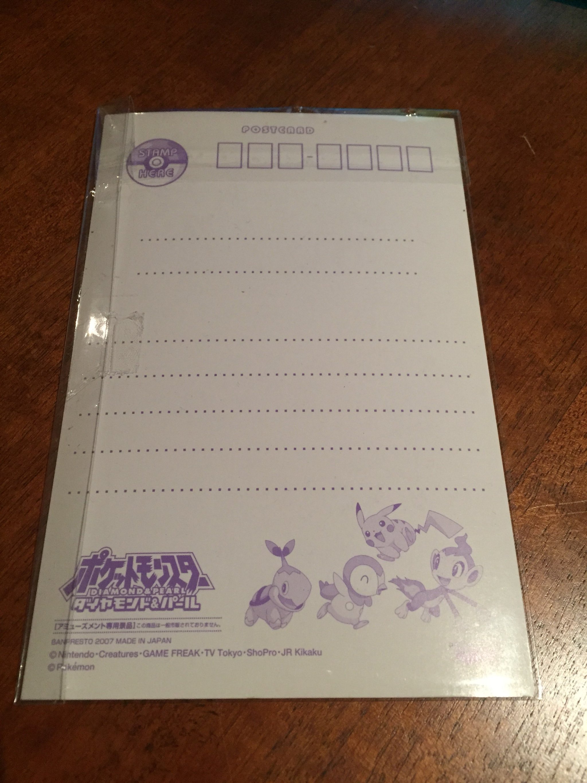This is a strange (and rare, from what I can tell!) postcard from the Diamond and Pearl era! It's licensed by Banpresto, and is apparently number 16 in the set. There are a few more for sale from the seller I purchased mine from, but this is the only place I've ever seen these postcards for sale!
