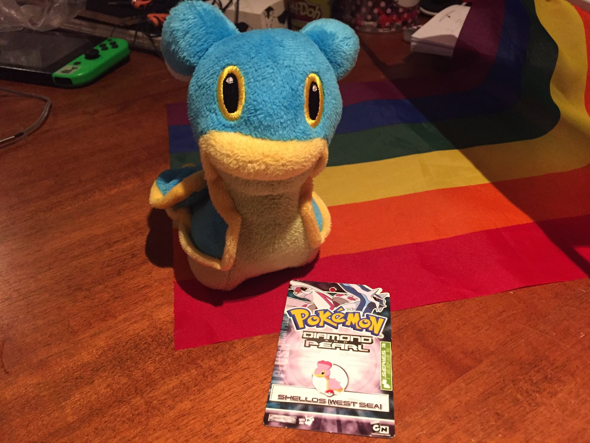 This is a bit of a weird one, isn't it?! The tag and this plush are separate from each other though, they didn't come together! I previously had the West Sea Shellos version of this plush as a kid, but I lost it after my childhood home's basement flooded - all I have left of it is the tag, which I kept in my card binder 💔 The East Sea plush was purchased in mid 2021, but has clearly seen a lot of love in its' life! I love having plushes where their previous owners clearly had a fondness for them.