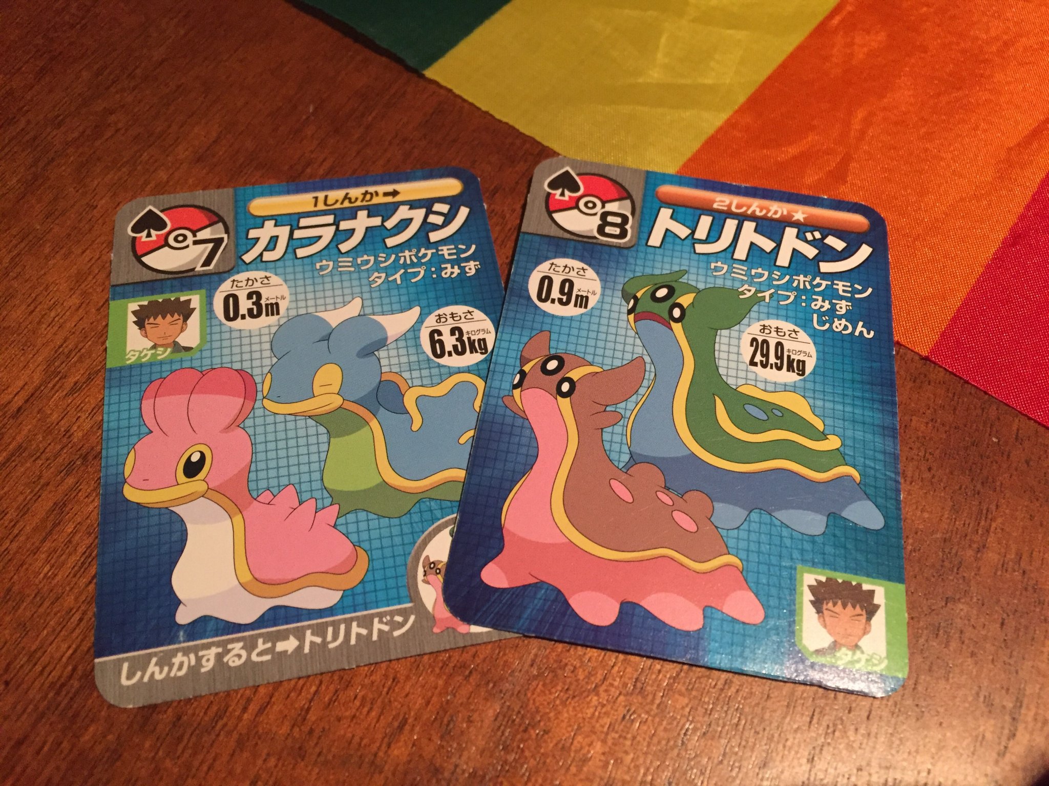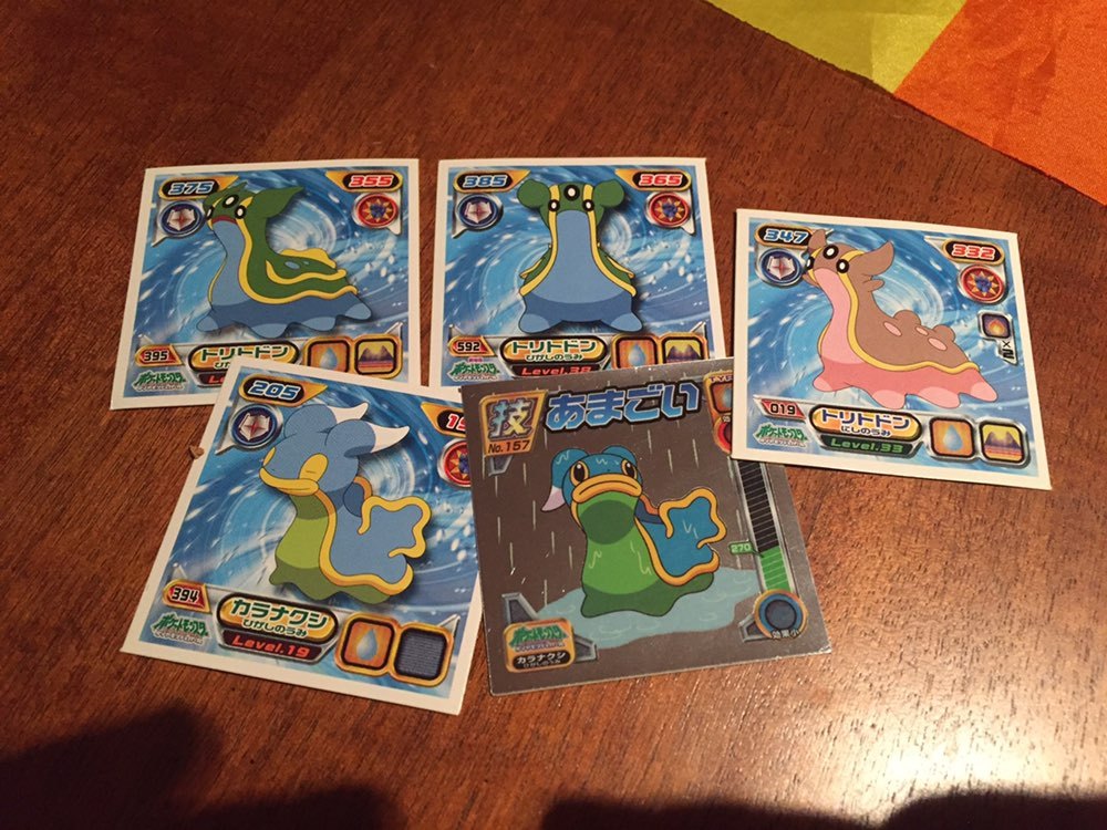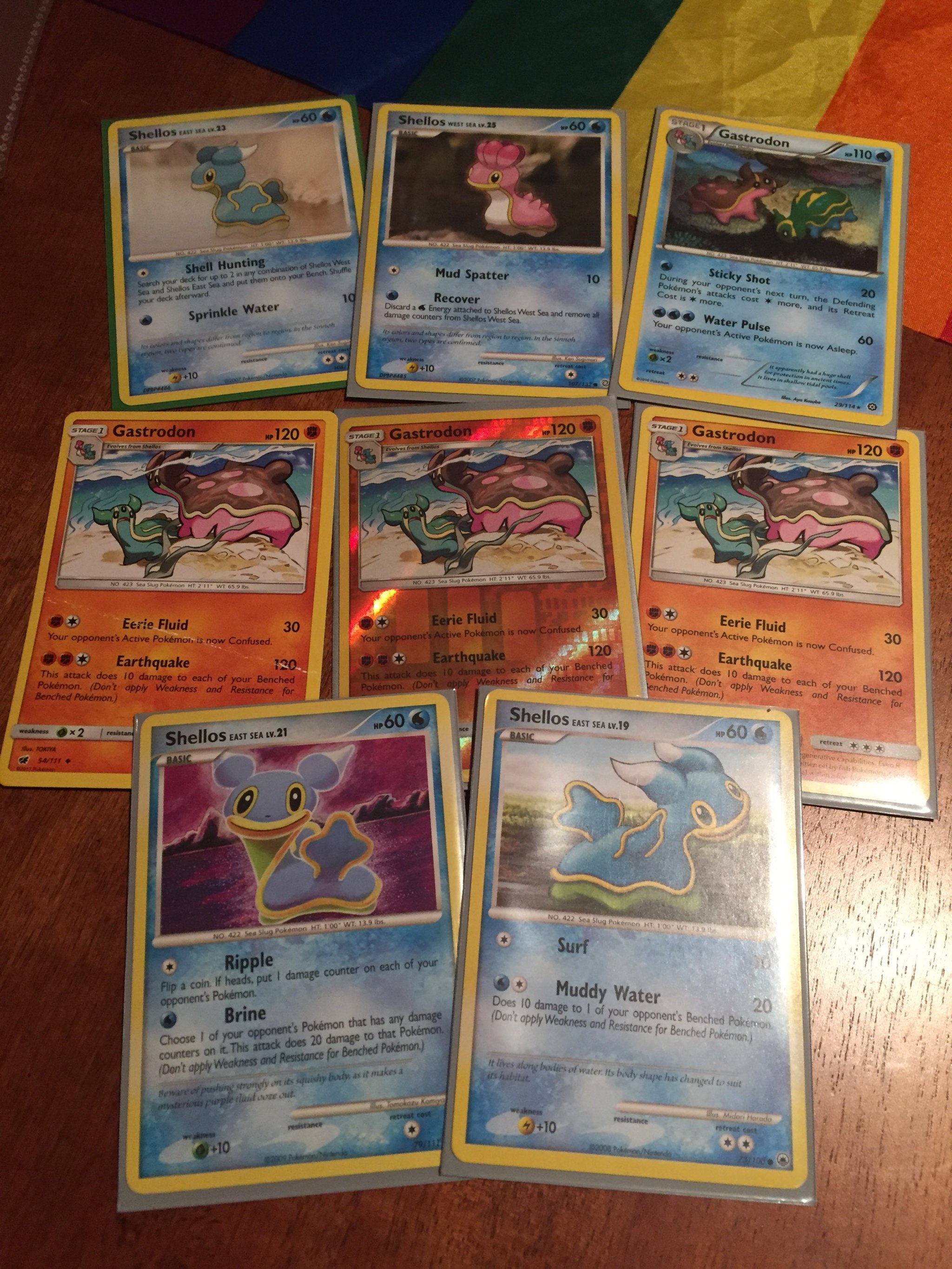 Assorted cards of both Shellos and Gastrodon! All three of the middle cards have been gifted to me by others, and I treasure all of them ;w; The one with the crease in it was given to me by my best friend's younger brother - he traded some of his cards on the playground for it to give it to me! :sob: