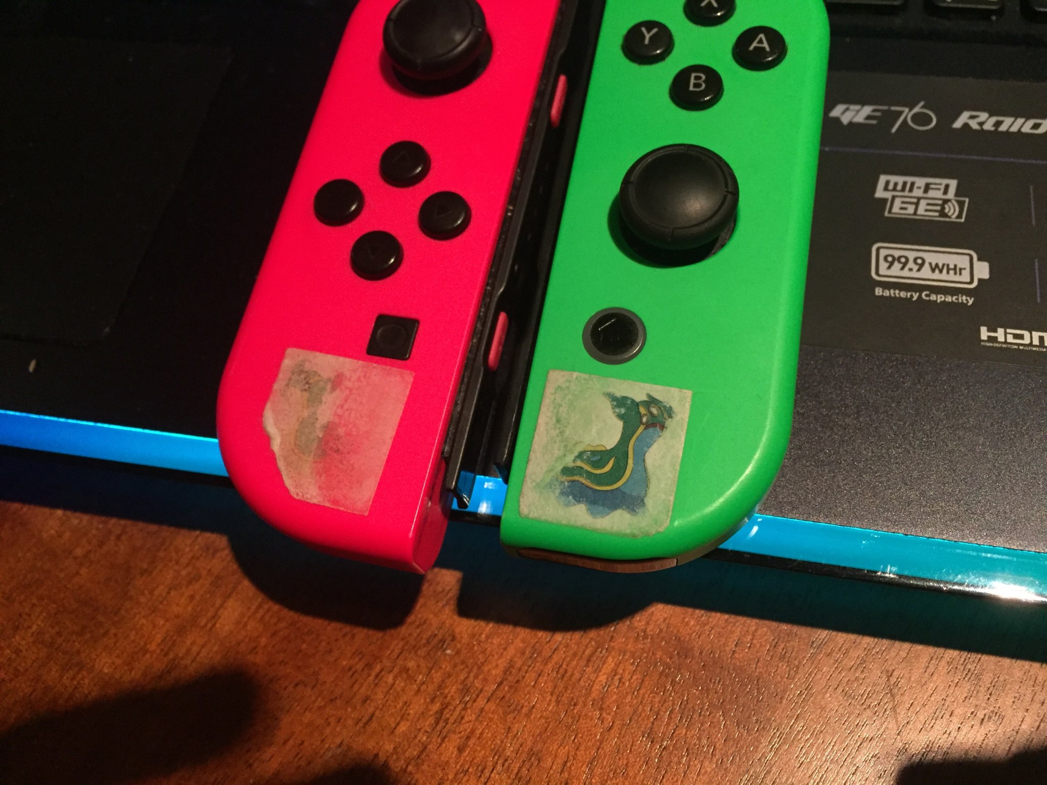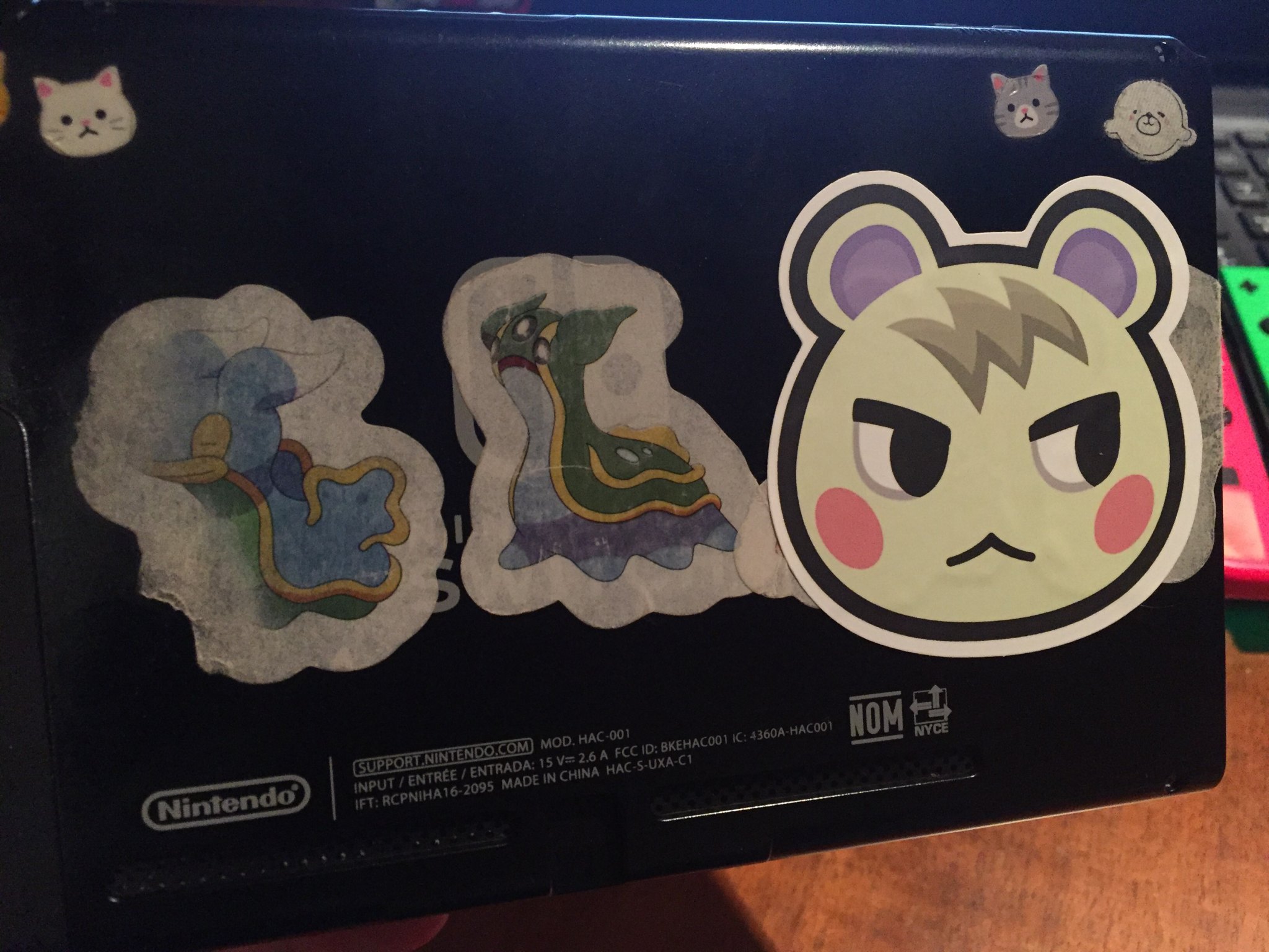 The extremely worn stickers on my Switch! There were stickers of West Sea Shellos and Gastrodon as well, but they ended up so worn and damaged from the heat of my Switch that I put Marshal's face overtop of them 💔